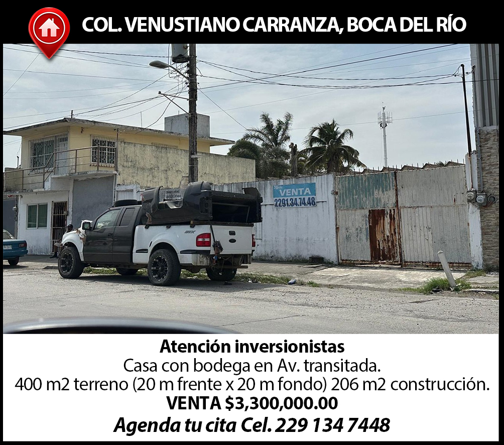 COL. VENUSTIANO Carranza, Boca del Río, casa con bodega en av. Transitada. 400m2 de terreno (20 mts de frente x 20 de fondo) 206 m2 de construcción. $3,300,000. Inf.2291347448