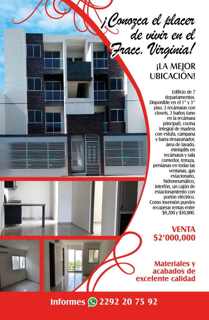 GREEN Tower Fracc. Virginia, cerca del estado de béisbol, c/minisplit inverter y paneles solares, 3 recámaras, ppal c/vestidor, 3 baños, cocina integral, área de lavado, garaje 2 autos, bodega. $37,000. Tel.2299270838, 2293300602