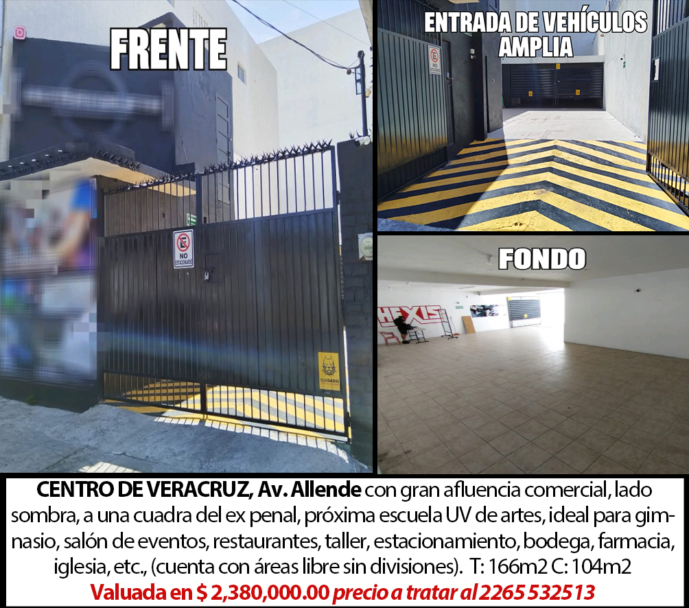 CENTRO Veracruz, Avenida I. Allende, con gran afluencia comercial, local lado sombra, a una cuadra del ex penal, próxima escuela UV de artes. Ideal para gimnasio, salón de eventos, restaurants, taller, estacionamiento, bodega, farmacias, iglesia, etc. (cuenta con áreas libre sin divisiones). T: 166m2 C: 104m2. Valuada en $ 2,380,000 precio a tratar al 2265532513