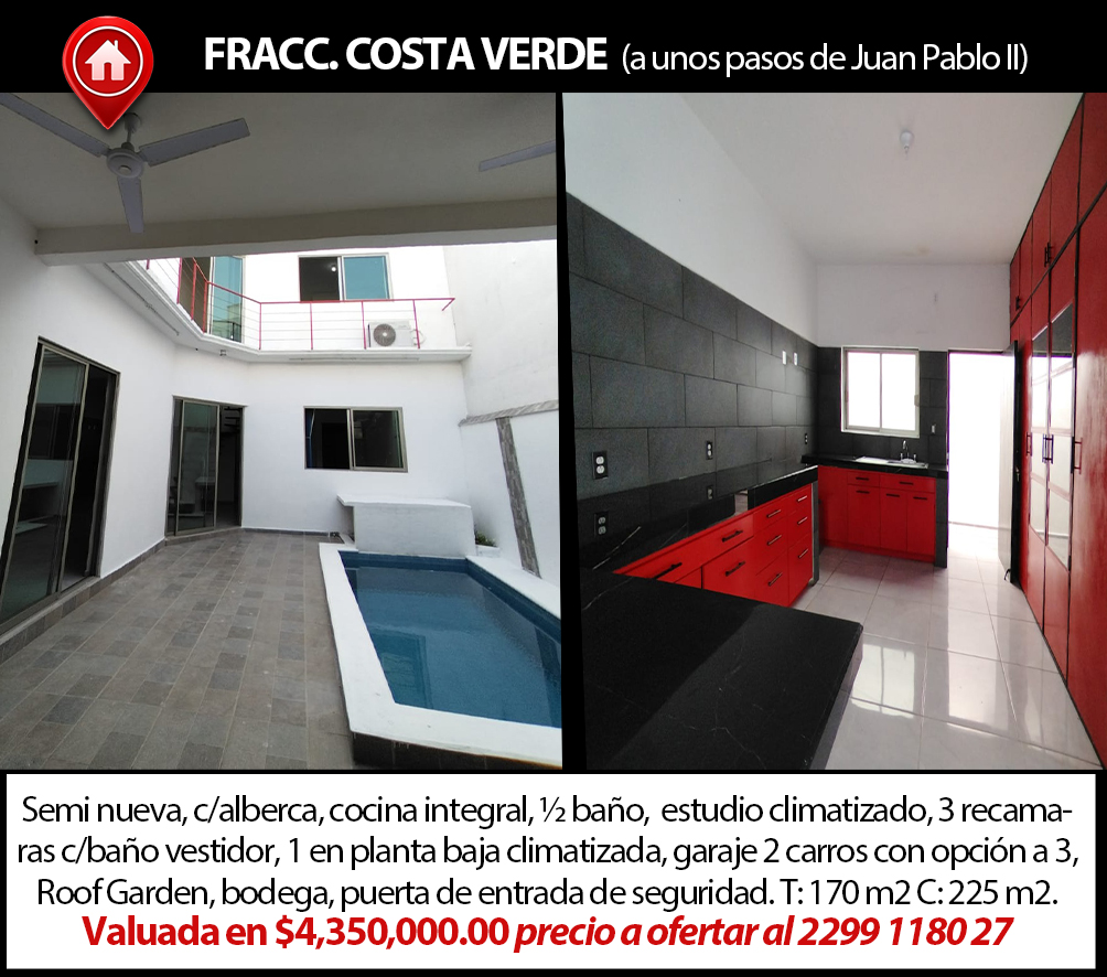 COSTA Verde, cocina integral c/estufa, campana, alacena y barra desayunador, medio baño de visitas, patio amplio, cuarto de servicio, bodega, 3 recámaras, 2 ½ baños, garaje eléctrico 2 autos. $3,650,000. Tel.2299270838, 2291212549