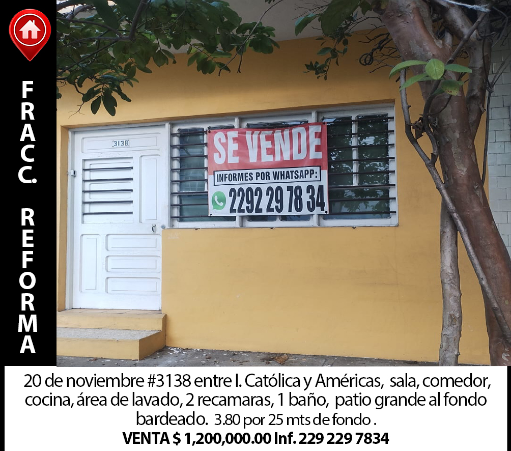 REFORMA bien ubicada, por Martí. fresca y segura, sala, comedor, cocina, desayunador, baño, cuarto de lavado, patio, 3 recamaras amplias c/climas, lámparas, cortinas, baño, balcón, gaje 1 auto. Se renta solo para casa habitación. Inf.2291283177