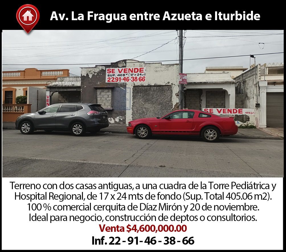 LAFRAGUA, terreno con 2 casas antiguas, a una cuadra de la Torre Pediátrica y Hospital Regional, de 17 x 24 mts de fondo (Sup. 405.06 m2). 100 % comercial cerquita de Díaz Mirón y 20 de noviembre. Ideal para negocio, construcción de deptos o consultorios. $4,600,000. Inf.2291463866