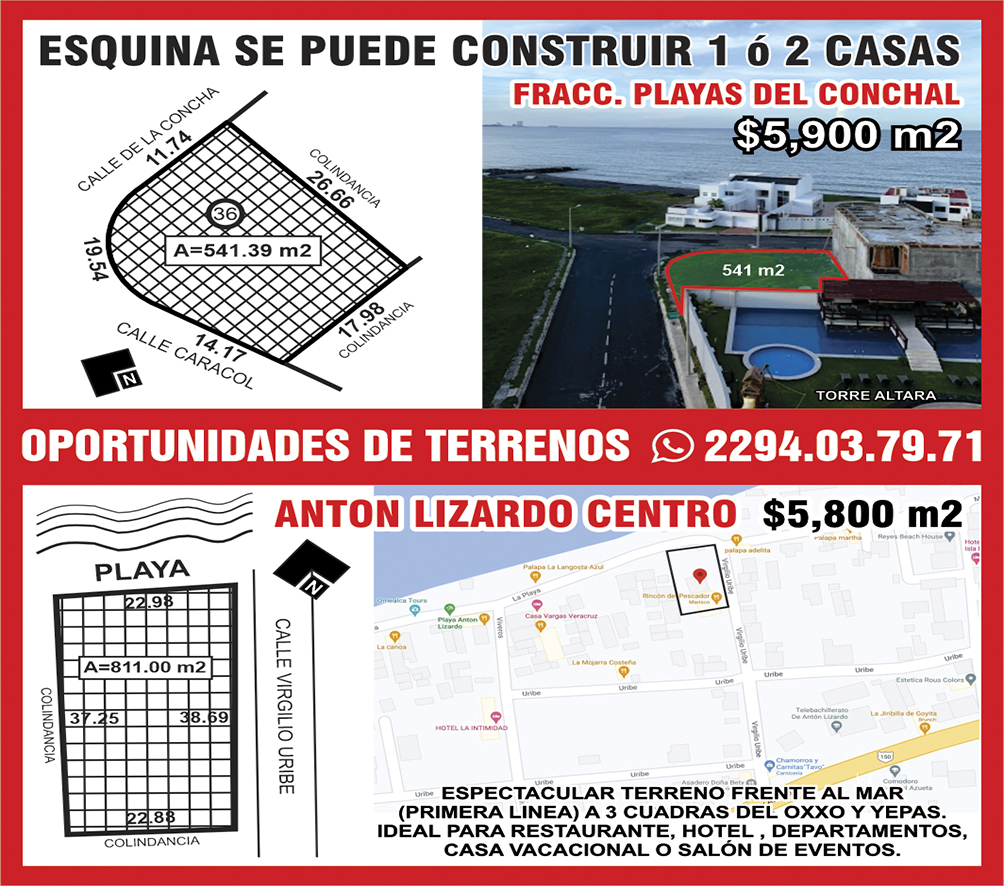 PLAYAS Del Conchal: 541 m2 en esquina, $6,100 m2, para inversionistas, se puede dividir para construir 2 casas excelente ubicación, zona VIP, frente al mar. Cel.2294037971