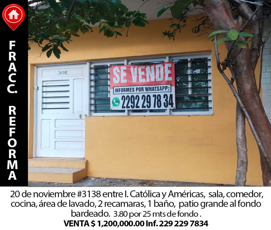 REFORMA bien ubicada, por Martí. fresca y segura, sala, comedor, cocina, desayunador, baño, cuarto de lavado, patio, 3 recamaras amplias c/climas, lámparas, cortinas, baño, balcón, gaje 1 auto. Se renta solo para casa habitación. Inf.2291283177