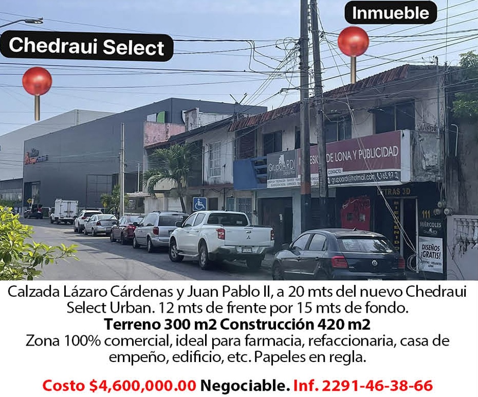 CALZADA Lázaro Cárdenas y Juan Pablo II, a 20 mts del nuevo Chedraui Select Urban. 12 mts de frente por 15 mts de fondo. Zona 100% comercial, ideal para farmacia, refaccionaria, casa de empeño, edificio, etc. Papeles en regla. T: 300 m2 C: 420 m2. $4,600,000. Negociable. Inf.2291463866