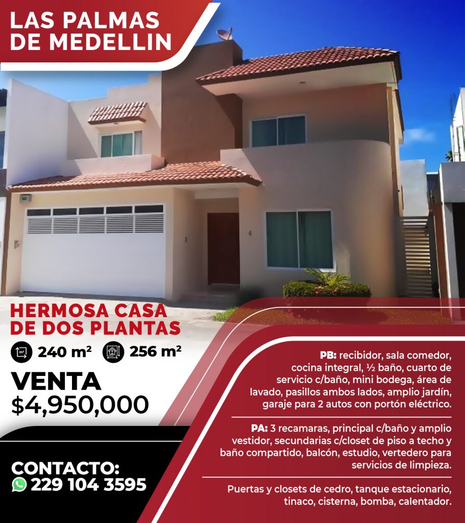 LAS PALMAS DE MEDELLÍN, HERMOSA CASA DE 2 PLANTAS: PB: RECIBIDOR, SALA, COMEDOR, COCINA INTEGRAL, ½ BAÑO, CUARTO DE SERVICIO C/BAÑO, MINI BODEGA, ÁREA DE LAVADO, PASILLOS AMBOS LADOS, AMPLIO JARDÍN, GARAJE PARA 2 AUTOS CON PORTÓN ELÉCTRICO. PA: 3 RECAMARAS, PRINCIPAL C/BAÑO Y AMPLIO VESTIDOR, SECUNDARIAS C/CLOSET Y BAÑO COMPARTIDO, BALCÓN, ESTUDIO, VERTEDERO PARA SERVICIOS DE LIMPIEZA. PUERTAS Y CLOSETS DE CEDRO, TANQUE ESTACIONARIO, TINACO, CISTERNA, BOMBA, CALENTADOR. T: 240 M2 C: 256 M2. $4,950,000. INF.2291043595