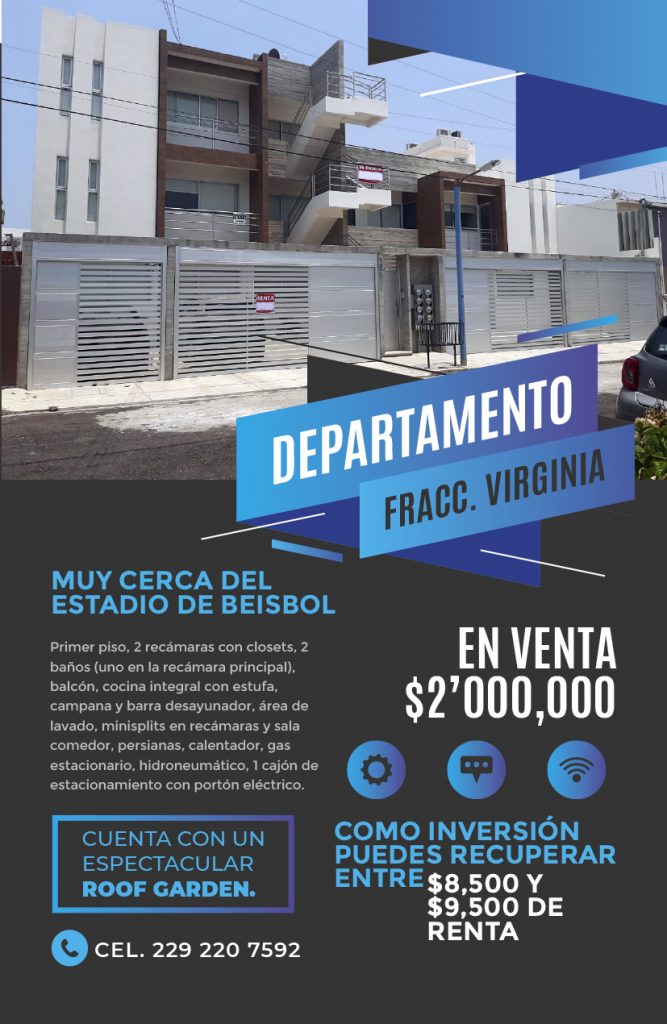 GREEN Tower Fracc. Virginia, cerca del estado de béisbol, c/minisplit inverter y paneles solares, 3 recámaras, ppal c/vestidor, 3 baños, cocina integral, área de lavado, garaje 2 autos, bodega. $37,000. Tel.2299270838, 2293300602
